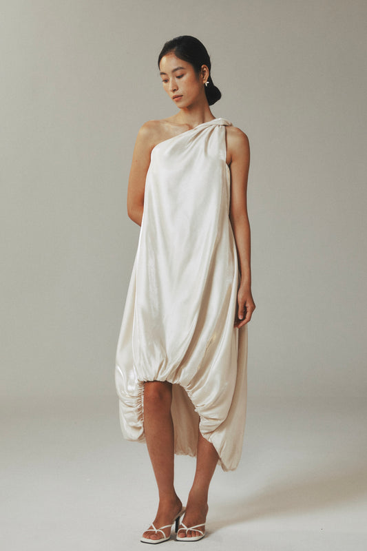 One-Shoulder Gold Satin Teardrop Maxi Dress
