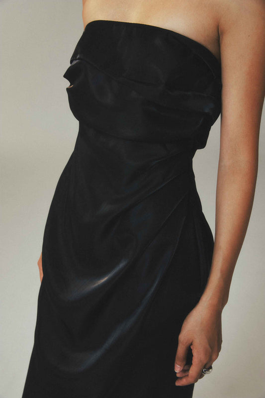 Elegant Black Satin Strapless Sheath Dress with Pile Pleats
