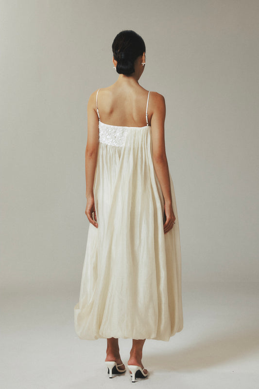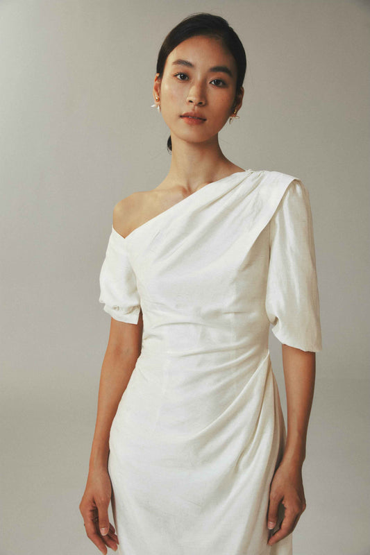 Linen Cotton Maxi Dress with Irregular Diagonal Pleats in Beige