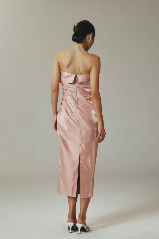 Elegant Pink Satin Strapless Sheath Dress with Pile Pleats