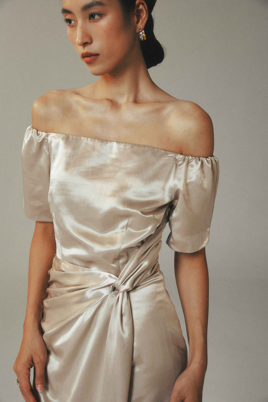 Champagne Off the Shoulder Ice-Silk Pleated Maxi Dress