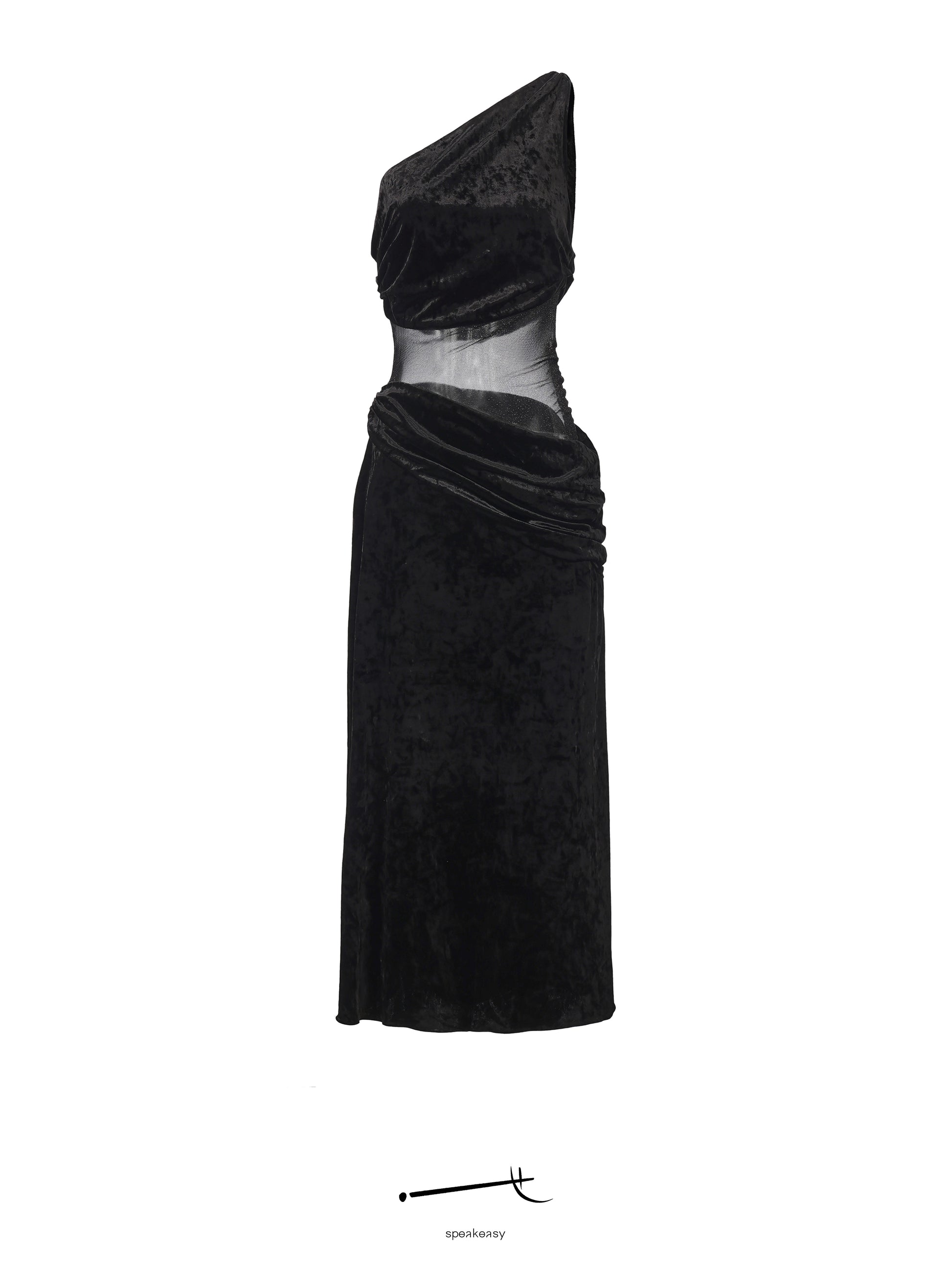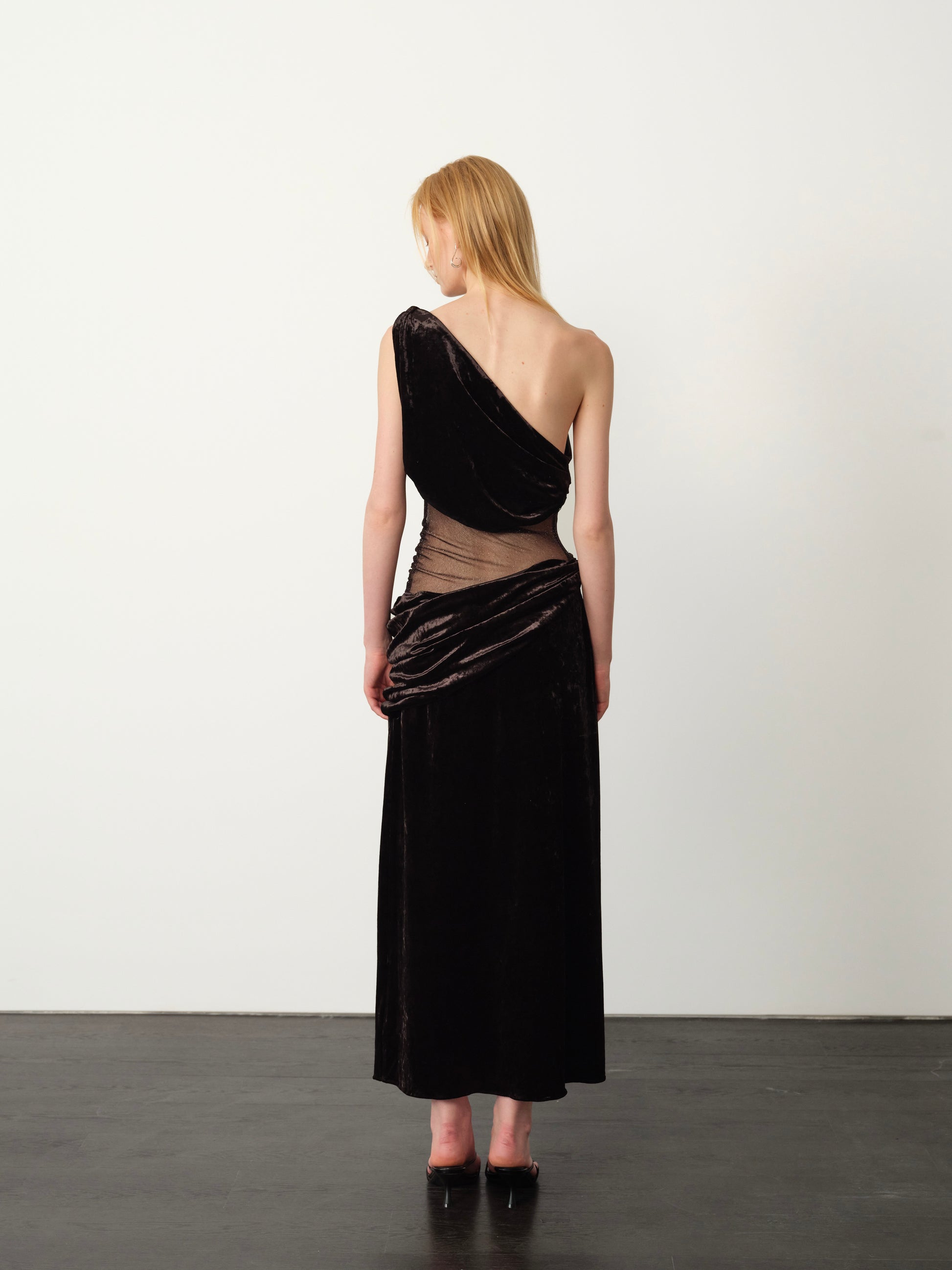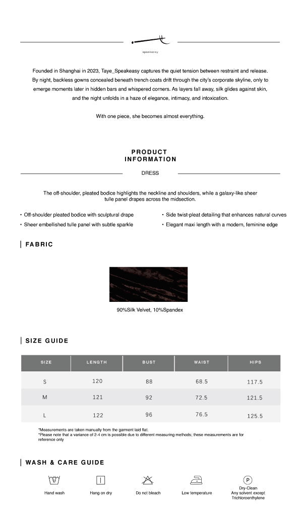 Inspired by the golden glow of Florence, this statement maxi dress pairs sensual structure with ethereal softness. The off-shoulder, pleated bodice highlights the neckline and shoulders, while a galaxy-like sheer tulle panel drapes across the midsection. Side twist pleats flow naturally along the body’s curves, creating a bold yet refined feminine presence.